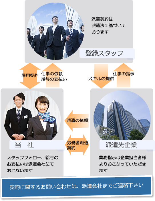 - 事業種別毎に異なる多忙期に併せて、理想的な人員計画が立てられる。もし、これを正社員で行えば固定費の大幅増加になる。また、アルバイトで行っても人員確保の確実性の問題や、人員管理の煩雑化、職務能力のバラツキ、広告宣伝費の増加という問題が発生する。